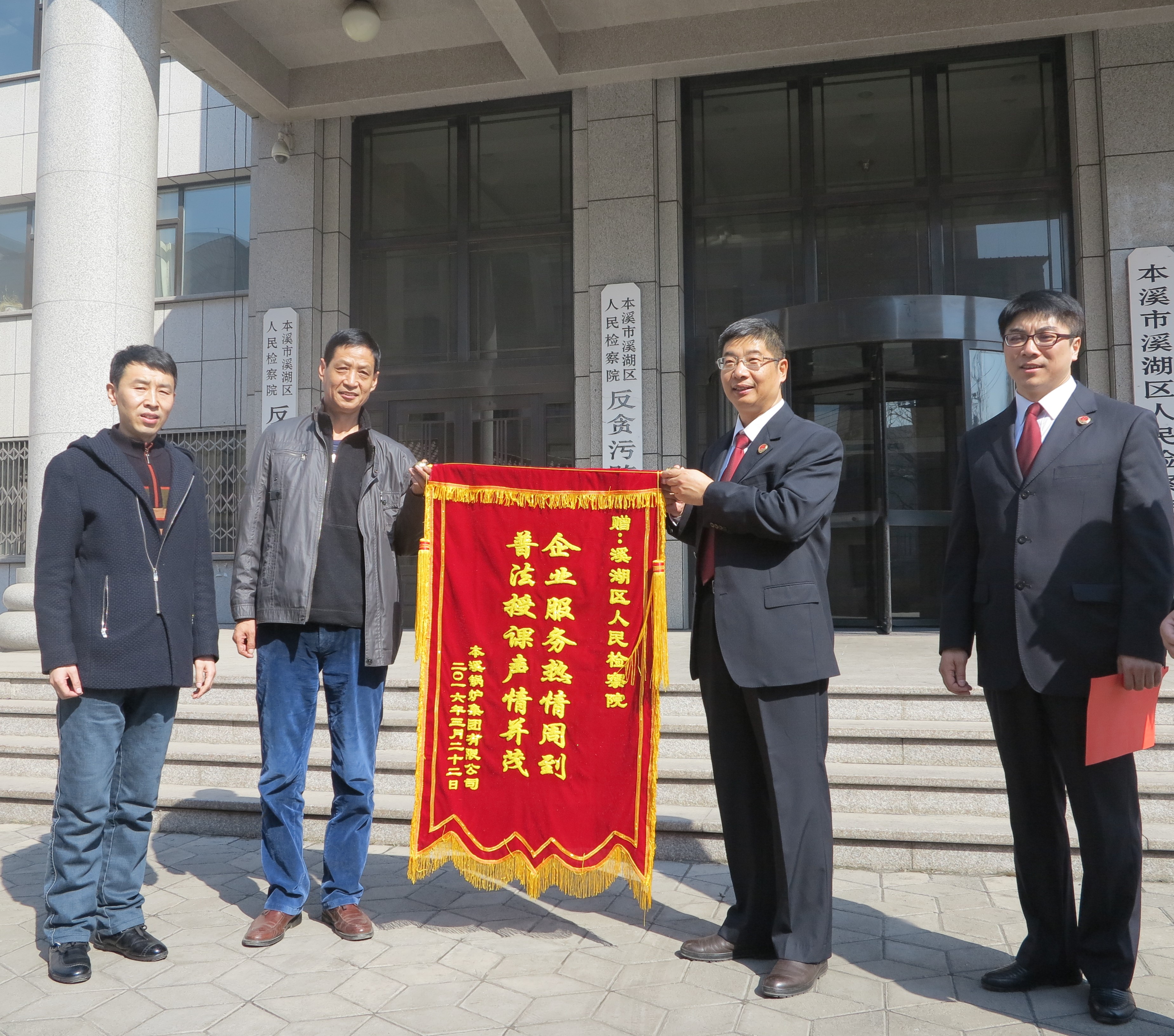 3月22日上午,本溪锅炉(集团)有限公司将一面“企业服务热情周到、普法授课声情并茂”锦旗和一封感谢信送到本溪市溪湖区检察院郑成龙副检察长的手中,对本溪市溪湖区检察院为企业健康发展提供的法律保障表示由衷的感谢。