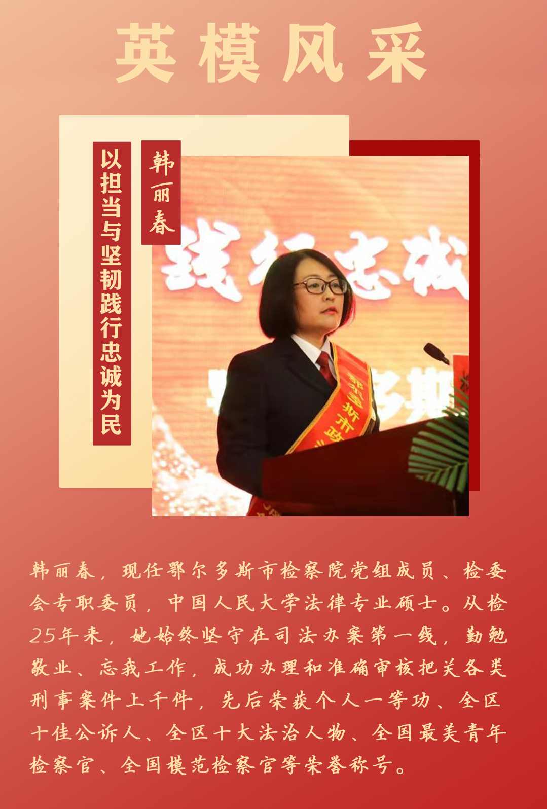 韩丽春,一个敢担当、善作为的女检察官,一个初心不改、守望正义的共产党员,25年持之以恒,久久为功,取得了骄人的工作业绩。“让人民群众在每一个司法案件中都感受到公平正义”是她毕生的追求,她和她引领的公诉人团队似北疆高原上栉风沐雨的劲草磐松,更是扎根在检察战线上的最美风景。