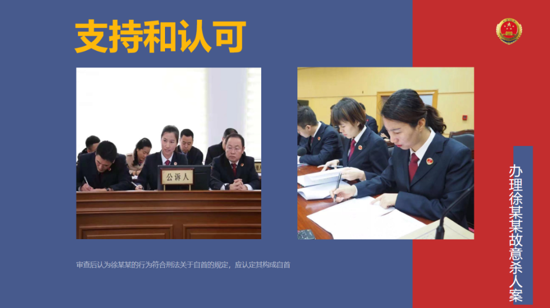 办理徐某某故意杀人案时,我发现被告人可能有自首情节未被认定,经过审查案卷材料、讯问被告人、走访出警的公安人员,证实徐某某接到公安传唤电话后,虽未第一时间到案,但在处理完个人事务后,其自愿、主动地来到公安查办案件现场,最终被抓获,其行为符合刑法关于自首的认定。被害人家属听到消息,知道有可能不会被判处极刑,多次找到我哭闹,声称要去上访。个别人对我说:“让法院去认定吧,干个工作让人告了,图啥。”公诉人图的不就是心中的公正嘛!