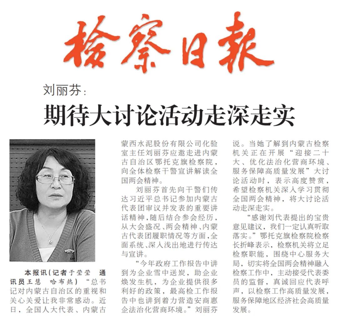 “总书记对内蒙古自治区的重视和关心关爱让我非常感动。”近日,全国人大代表、内蒙古蒙西水泥股份有限公司化验室主任刘丽芬应邀走进内蒙古自治区鄂托克旗检察院,向全体检察干警宣讲解读全国两会精神。